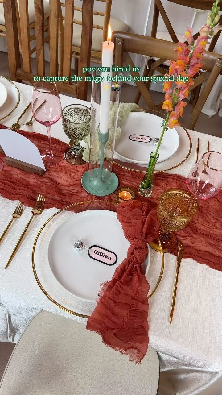 We’re all about catching those giggle-filled moments and behind-the-scenes peeks that make your love story or event uniquely yours. It’s the little things that count—the specially requested champagne in that perfect vintage blue glass, the get-ready moments, the thrifted outfit that you finally nailed.